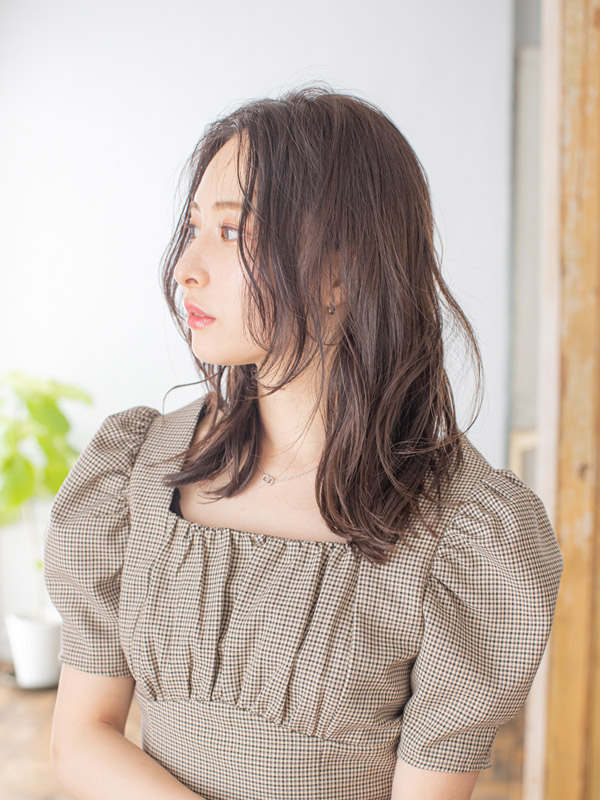 前髪はドライヤーで軽く立ち上げてから顔周りに入っているレイヤーはふんわりと巻き自然な動きを出しています。 バックはベースは波巻きで表面の毛束をミックス巻きし、ふんわりとした柔らかい印象のヘアスタイルに仕上げています。
